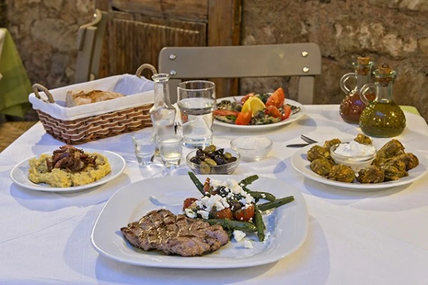 “Eggplant simmered with walnuts, fennel pies, and onion fritters are great preludes to such main courses as oven-baked lamb and a memorable moussaka.”
