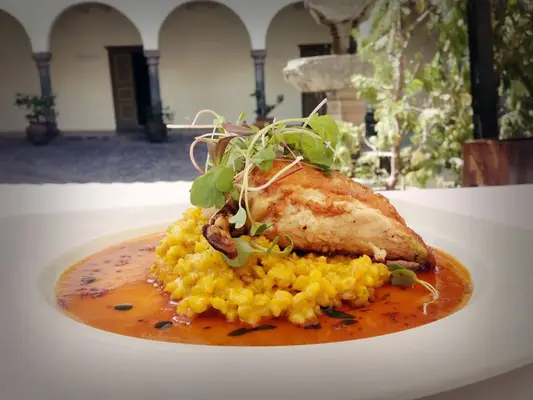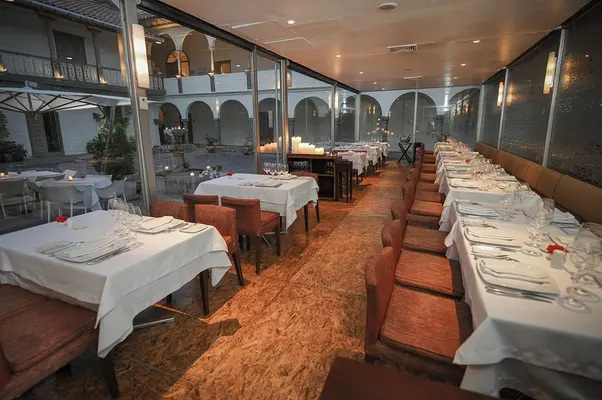 "Clashing brilliantly against the surrounding colonial building, this modern, minimalist glass-and-steel box in the middle of a cobblestone patio holds one of the city's most fashionable restaurants" Full review