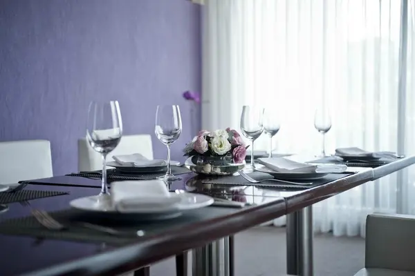 “Luxury hotel where the rooms have clean white lines with stylish purple accents.”