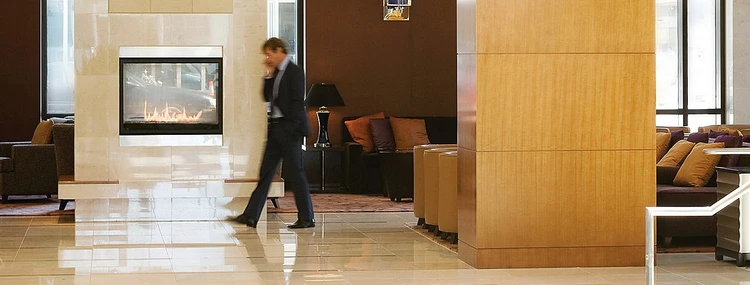 "The sleek, contemporary rooms at this luxury choice feature such high-end touches as grained wood paneling, stacked slate columns and marble bathrooms."