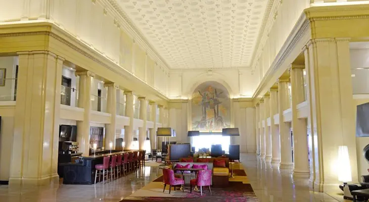 "The lobby is real showstopper, featuring marble columns and restored murals by legendary artist Allen True...sleek rooms include king beds or two queens, and the deluxe rooms have a bit more space. " Full review