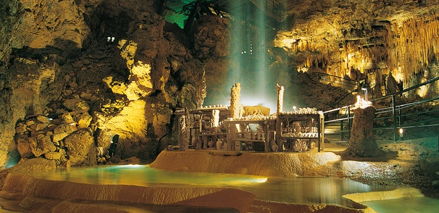 “In high season, reserve ahead for a guided tour of this vast cave with sparkling stalactites. It has an aerial basket for viewing the cavern in the round.”