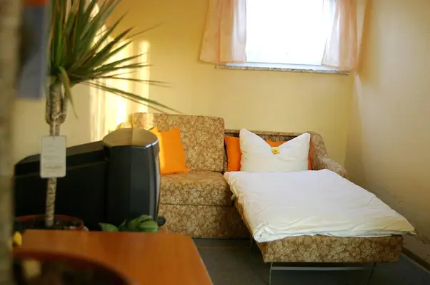 "In suburbs 4km south, a 15min walk from Mockritz. Facilities include a laundry, a small shop with a bakery and a pool in summer."