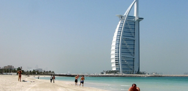 “Umm Suqeim Beach, which has incredible views of the Burj Al-Arab Hotel offshore, is a favorite of touring groups that briefly step onto the sand to snap pictures.”