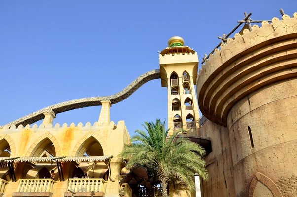 “Dubai's premier water park, Wild Wadi covers 12 acres and abuts Jumeirah Beach in the shadow of the Burj Al-Arab hotel.”