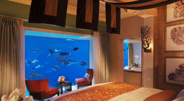 "An over-the-top playground for kids and adults alike, featuring rooms that look out at the Arabian Gulf and even underwater suites where guests can see sharks and rays right from their bathtub. "