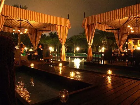 “Regularly voted the most romantic restaurant in Dubai, with seating within little Arabian tents set up amid the beautifully floodlit waters of one of the hotel’s swimming pools.”