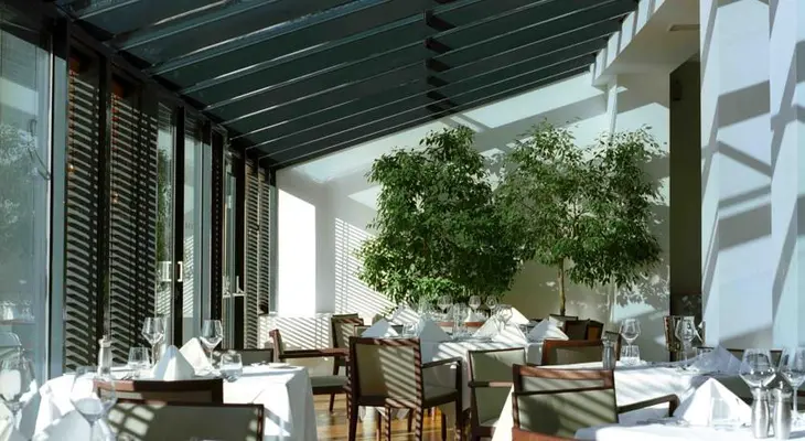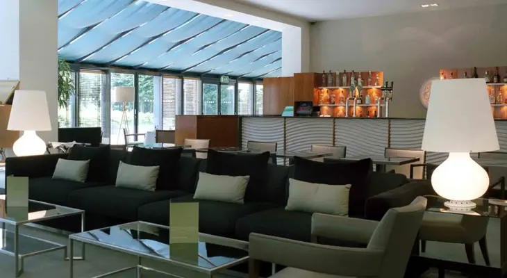 "Contemporary hotel overlooking suburban park, with smart marble-floored reception, stylish seating areas and chic bar."