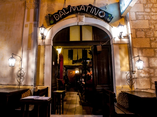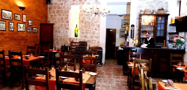 “One of the new stars on the restaurant scene, Dalmatino has a cozy, candlelit interior, with original stone walls, coffee-stained for effect, featuring faded photos of old Dubrovnik.”