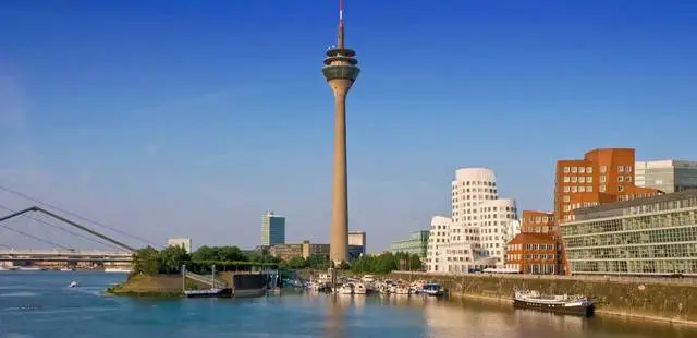 “Spearing the sky at the southern end of the Rhine promenade, the Rheinturm (which is brilliantly lit at night) has an observation deck at the 168m level of its overall height of 240m.”