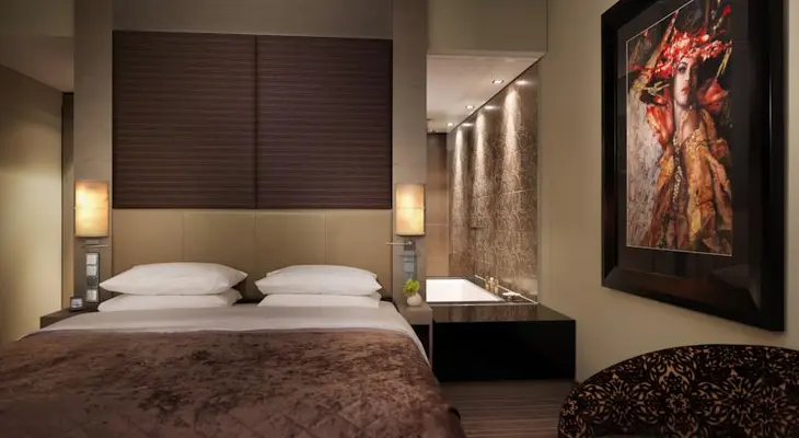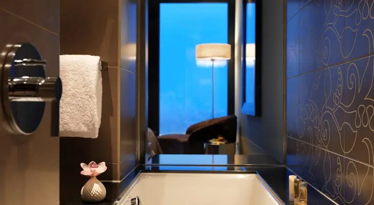 “The 303 contemporary rooms maximize the spectacular views through floor-to-ceiling windows, but the open concept might not be to everyone’s taste, with entry doors opening directly into the bathroom.”