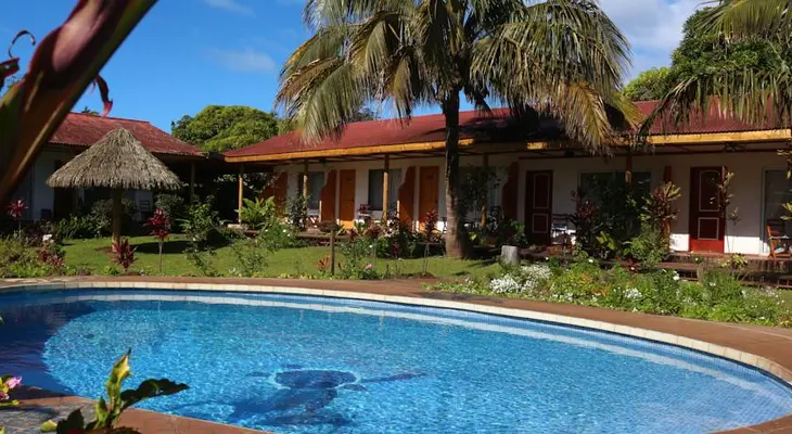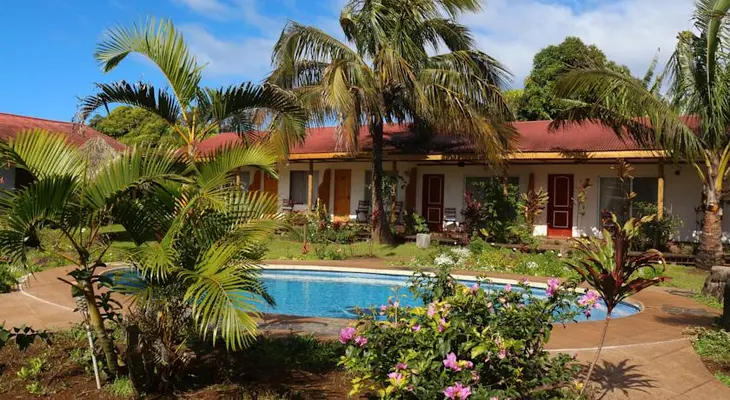 “A drive lined by palm and papaya trees leads to this charming small hotel.”