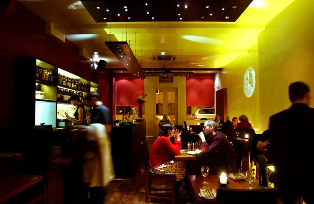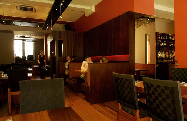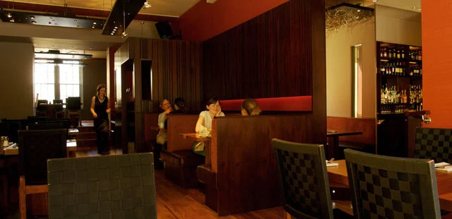 “Dark wood, lacquered maroon walls, and contemporary lighting isn't your typical veggie bistro decor, and a lot of diners here are even (gasp!) meat eaters.”