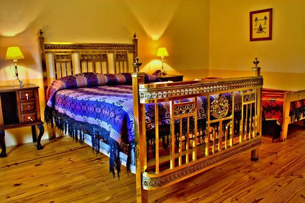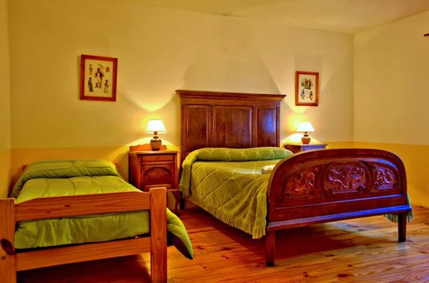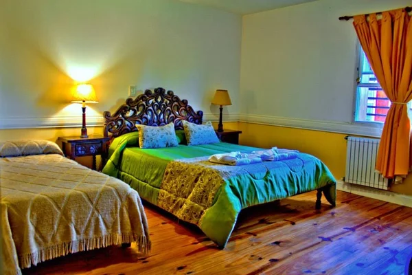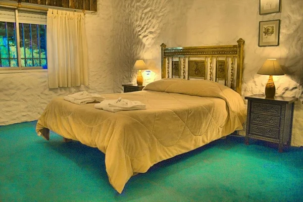 “Colonial furnishings and a lovely rock garden enhance this ranch-style retreat with chandeliers and antiques in creaky hallways.”