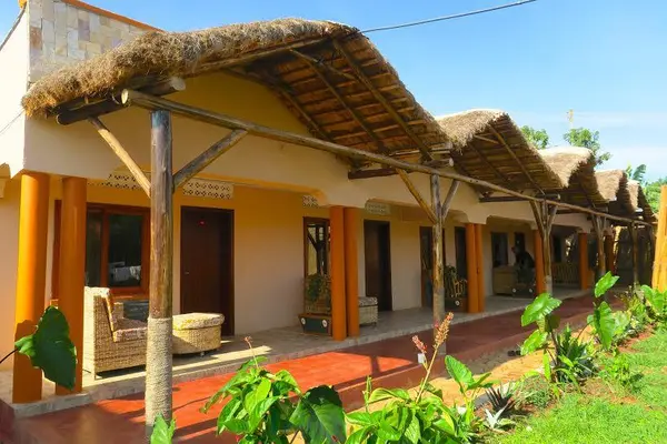 “Built around a flower-filled courtyard, this bright backpacker house clad in tangerine paint has simple rooms with nets but without screens.”