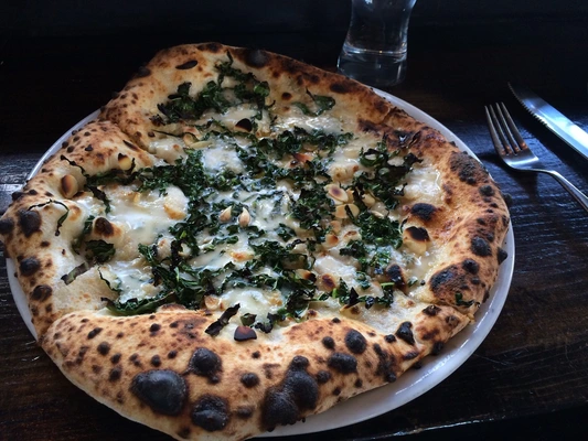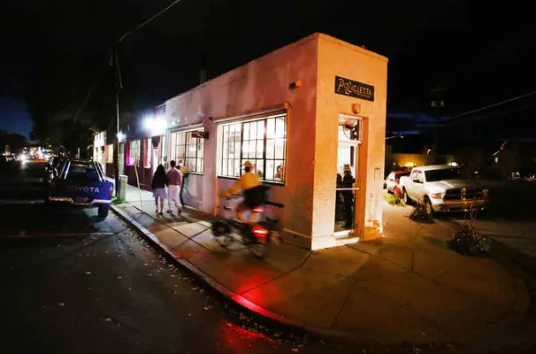 “Tiny Pizzicletta, where the excellent thin-crusted wood-fired pizzas are loaded with gourmet toppings like arugula and aged prosciutto, is housed in a sliver of a white-brick building.”