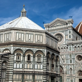 "Across from the cathedral is Florence's 11th-century Romanesque baptistry, an octagonal striped structure of white-and-green marble." Full review