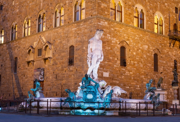 "The seat of power, with the Palazzo Vecchio and Uffizi at its heart, it's a cobbled, open-air gallery of grand statues, a gushing fountain, and locals cycling through."
