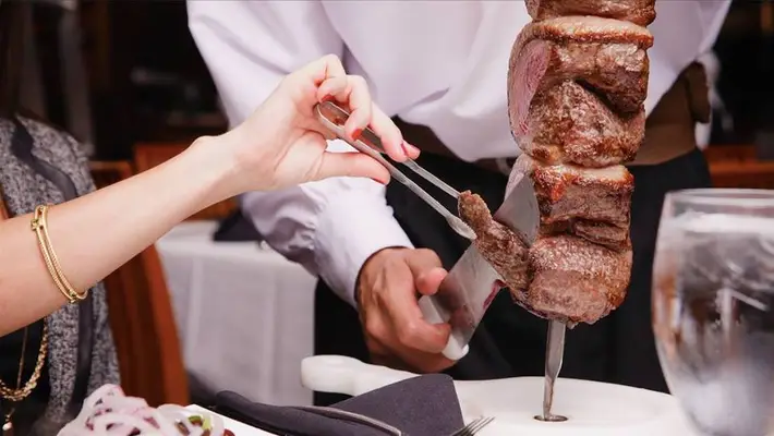 “Follow your nose as waiters wander through the dining room brandishing massive skewers of more than a dozen different meats, from which they'll carve chunks for any diner. ”