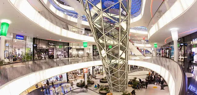 “This futuristic shopping center twists and turns you on metal paths, guiding you fluidly through the best shopping in Frankfurt.”
