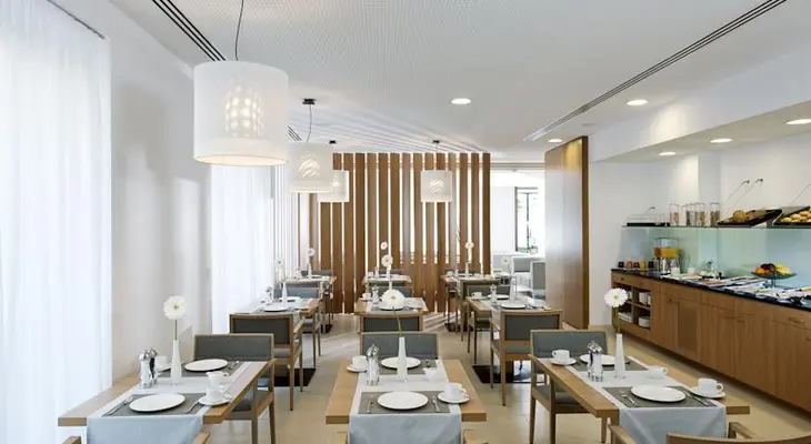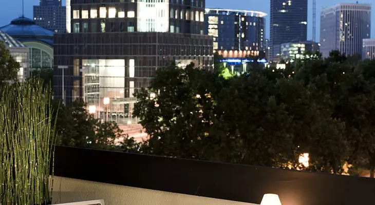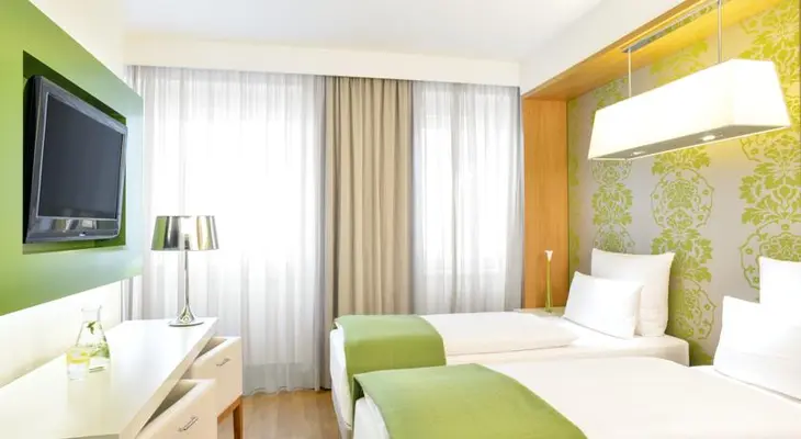 “The 65-room, mid-range NH Frankfurt Messe is modern and friendly, with pale decor accented by lime-green throughout the six-story building.”