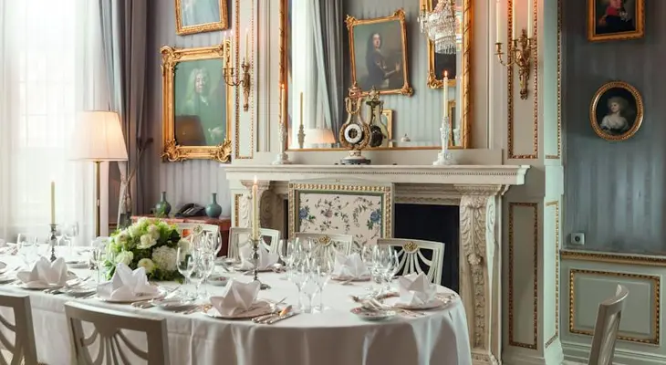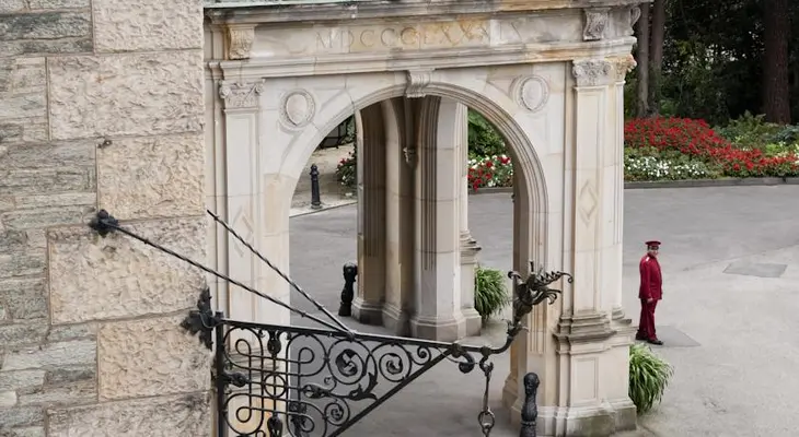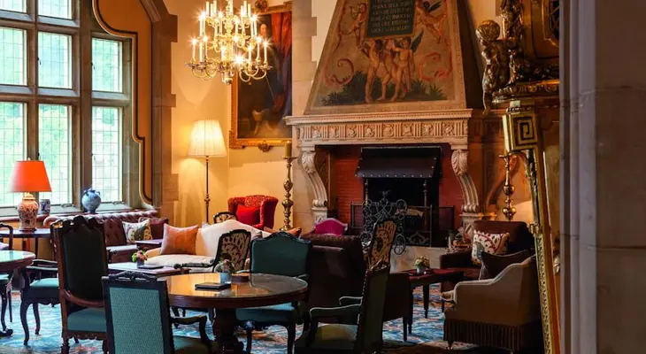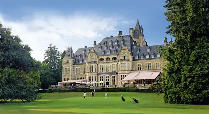 “It's richly filled with furnishings and works of art and is surrounded by a park with old trees, a grotto, a rose garden, and an 18-hole golf course.”