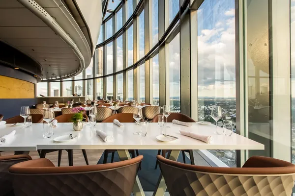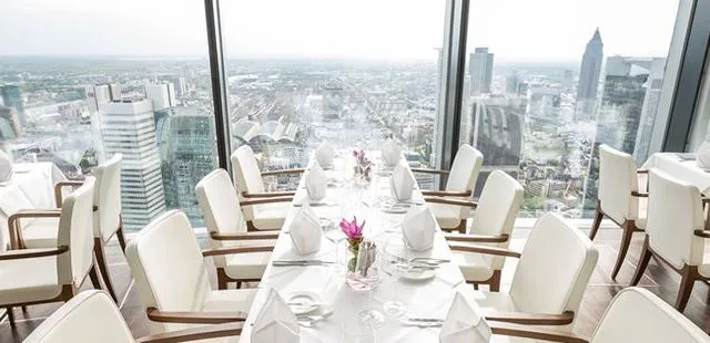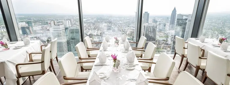 "187m above the ground, the Main Tower offers impressive views over Frankfurt, and ambitious, international cuisine in a modern setting. Set menu only in the evenings." Full review