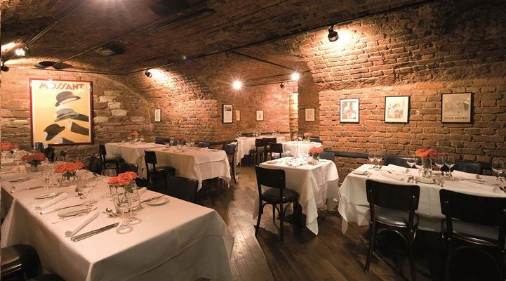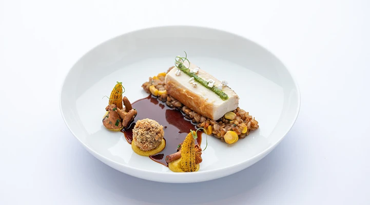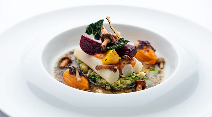 “Try the sea bass with a mild pepper crust with chanterelles, risotto, and baked calves'-head ravioli, or the sole rolls with Périgord truffle with fried artichokes and potato foam.”
