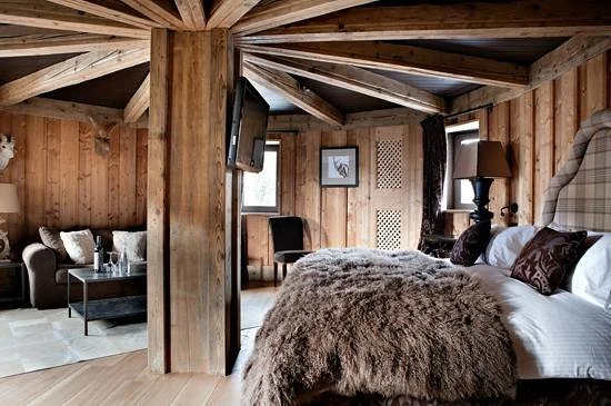 “Enchanting hotel of nine chalets assembled from original timbers and pine paneling from old structures acquired throughout the French Alps, offering a beautiful fantasy of Alpine life.”