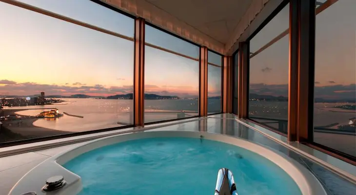 "Relax and unwind after a day of exploring by soaking in a whirlpool bath with views of the city and ocean. The hotel also offers Japanese suites that use traditional style elements."