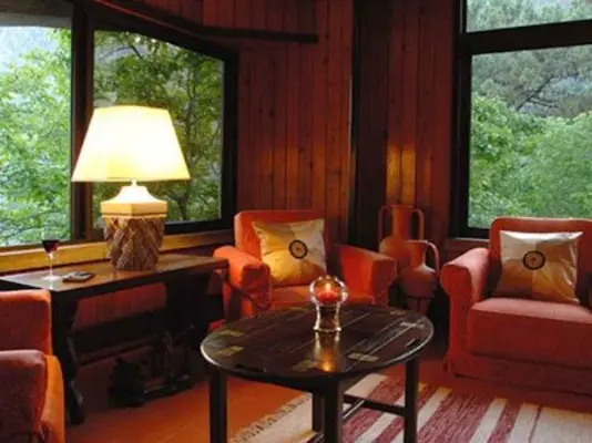 “Guest rooms at this cozy mountain lodge on the edge of a pine forest are mostly in the original 1930s building; some quarters are in a modern pine annex.”