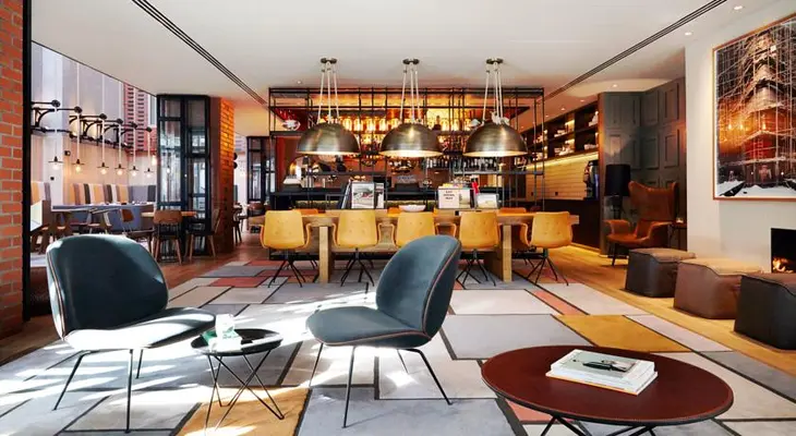 “An airy eight-storey atrium leads into soft-pastel spaces furnished with quirky modernist pieces by Vitra, Moroso and Gubi, while the rooftop bar and terrace opens out over the marina and Old Town.”