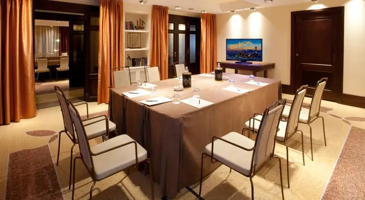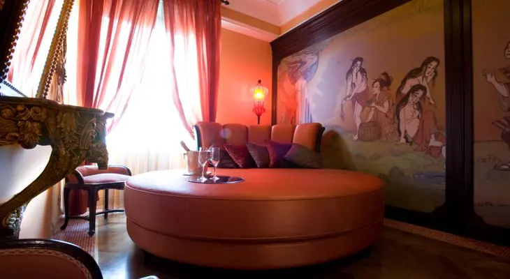 “Original accents like parquet floors, Murano chandeliers, and marble columns complement overstuffed leather chairs and carved wooden tables, all contributing to a pervasive sense of drama and history.”