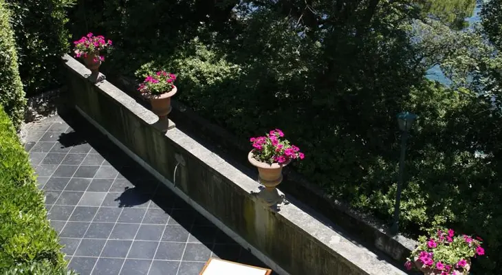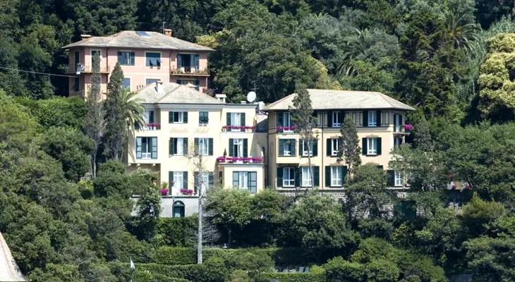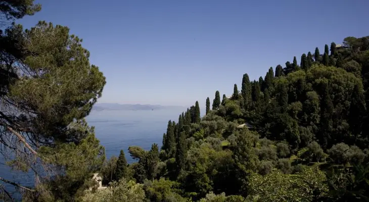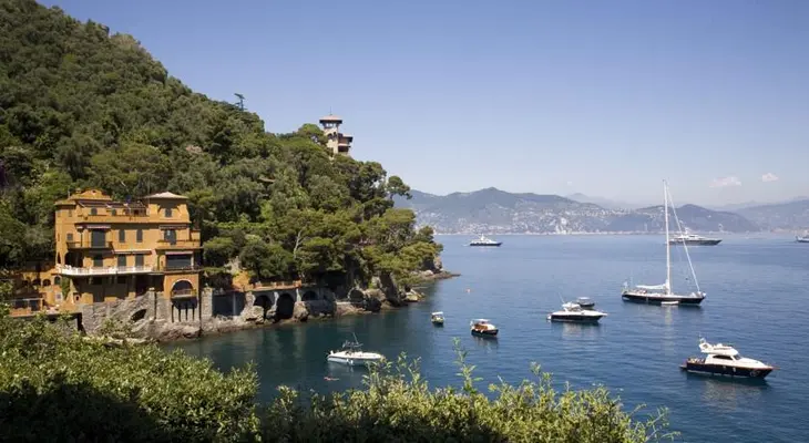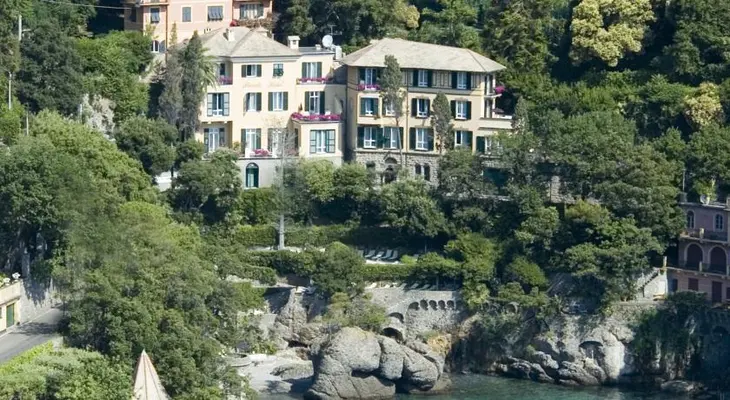 “Romantic period villa surrounded by lush gardens with modern rooms and views of Portofino.”