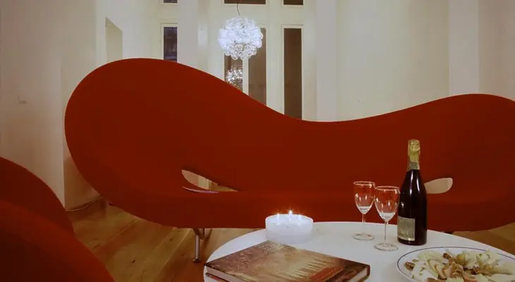 “The faded grandeur has been revived by stylish decor and simple, minimalist furniture that doesn’t detract from the original stucco ceilings and window details.”