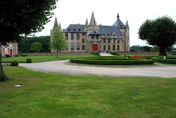 This grey-walled castle with stone-roofed towers and a turreted keep is surrounded by a moat. — Michelin Guide