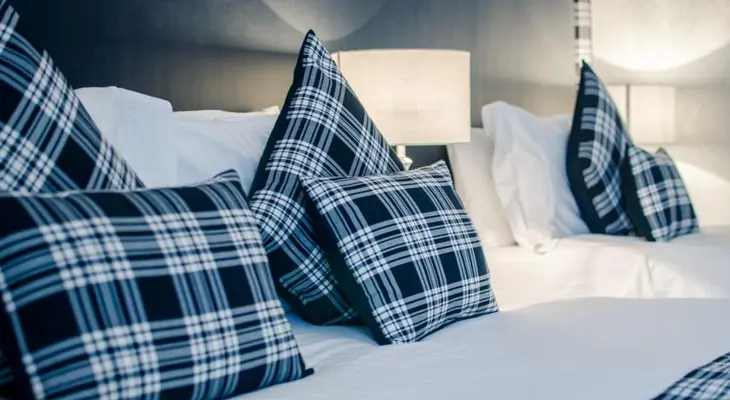 “The tartan in the reception area reflects the clan theme trhoughout the hotel.”
