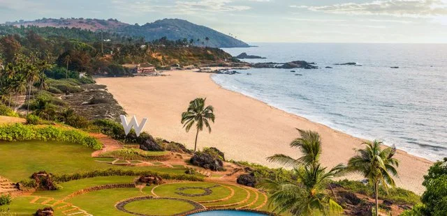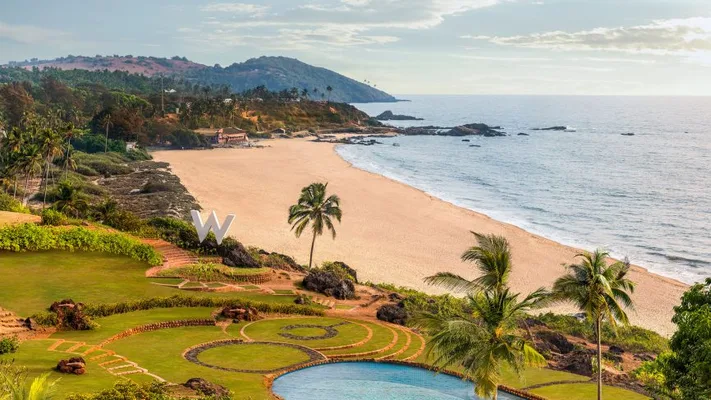 “The dark sands of Vagator Beach lead on from the red cliffs that line it.”
