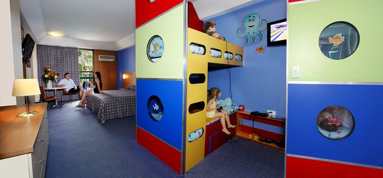“The 358-room upper-middle-range Paradise Resort Gold Coast goes out of its way for families with children, from colorful bunk beds and video game systems in most rooms to a large outdoor water park.”