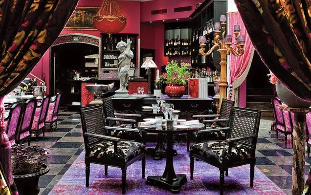 A dramatic hotel dining room split over two levels, with gloriously quirky lighting, striking flower arrangements by the owner, and belle époque oil paintings hanging proudly on the walls. — Michelin Guide