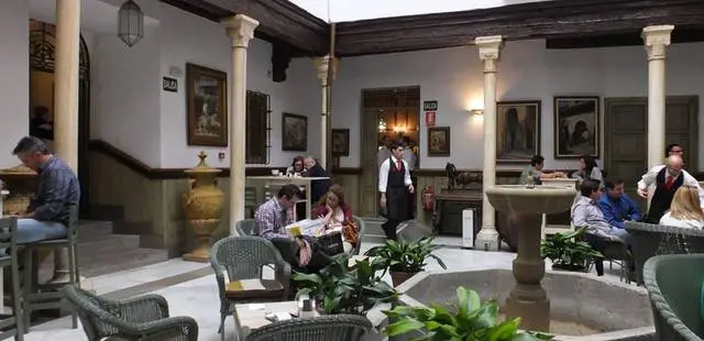 “This bar and restaurant, just off Plaza Nueva, is in a 17th-century palace with a stunning patio (complete with original marble columns) and peaceful garden.”