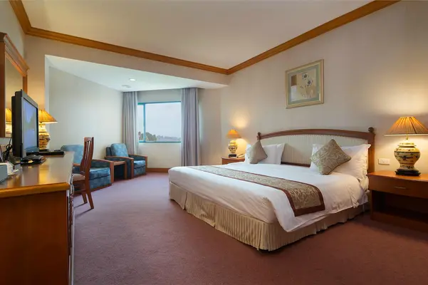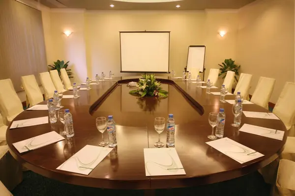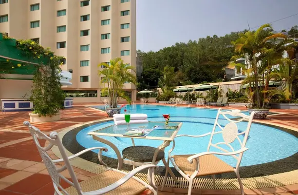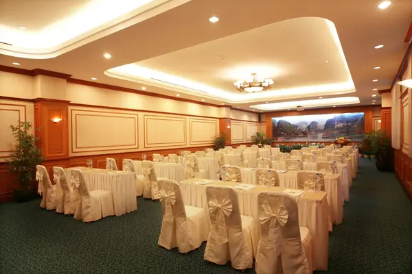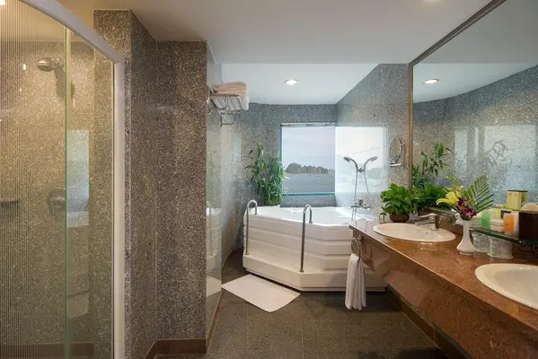 “A glass-fronted entryway looks out onto the bay from the spacious front lobby at this modern luxury hotel close to the ferry landing.”