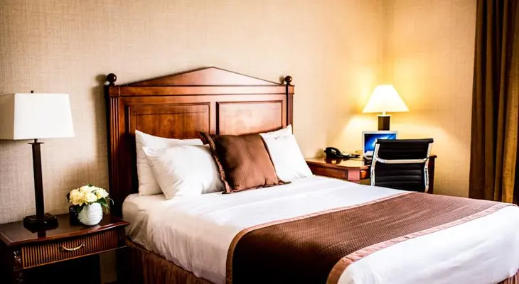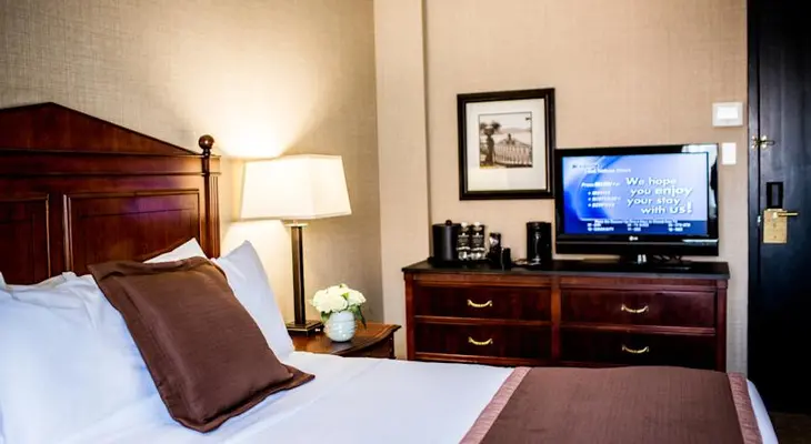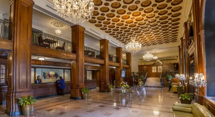 “With its high coffered ceiling, the lobby of this popular brown-brick hotel is spacious and elegant, with Art Deco details dating from its 1920s construction.”