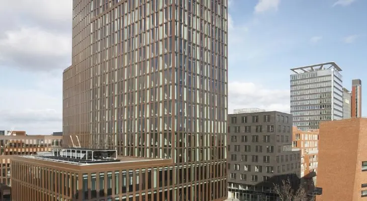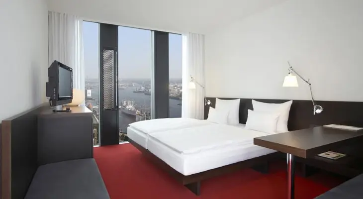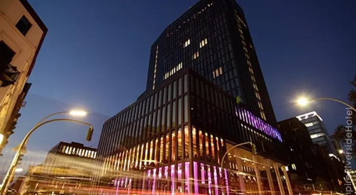 “Offers a great location between the HafenCity and downtown Hamburg, an elegant restaurant and lounge, plus a small spa area and top-floor bar with sweeping views of the city.”