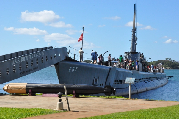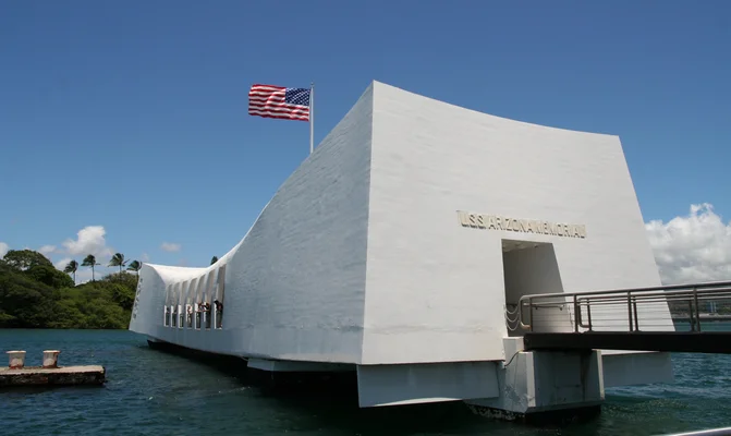 Floating over the hulk of a sunken battleship, the concave, 184-foot white-concrete bridge marks the permanent tomb of 1,177 sailors killed in the Pearl Harbor attack. — Michelin Guide