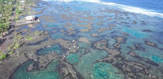 “Puako is known for giant tide pools, some deep enough to shelter live coral and other marine life. There's no sandy beach, but a narrow strip of pulverized coral and lava covers the shore. ”