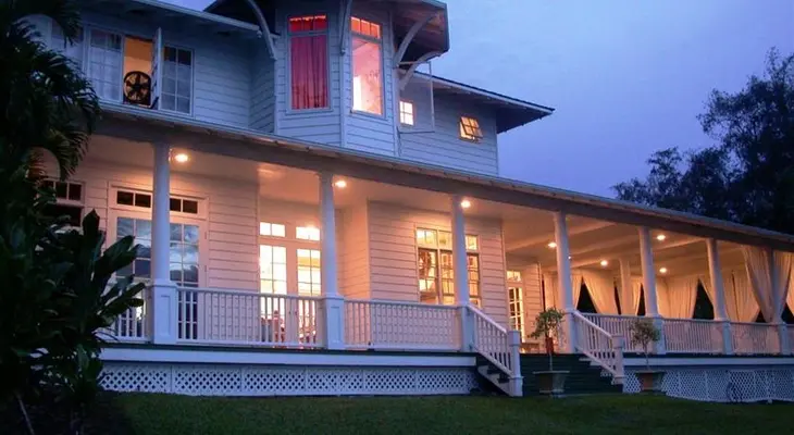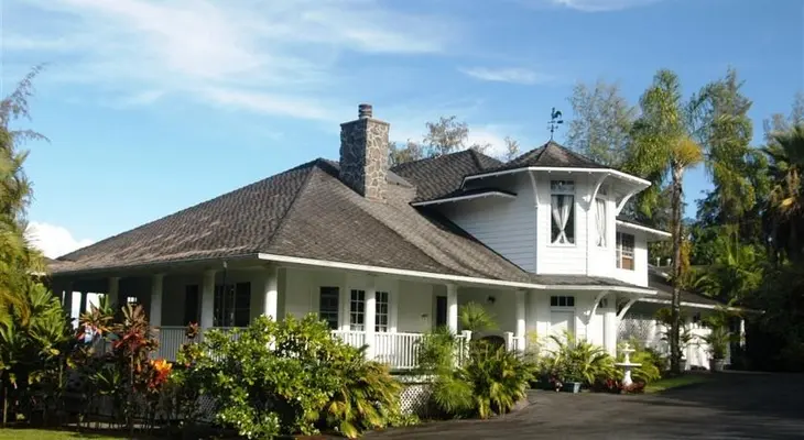 "This handsome Victorian-style mansion, 15 minutes north of downtown Hilo and a few minutes from Akaka Falls, is perched on the sea cliffs 100 feet above the crashing surf of the tropical coast." Full review