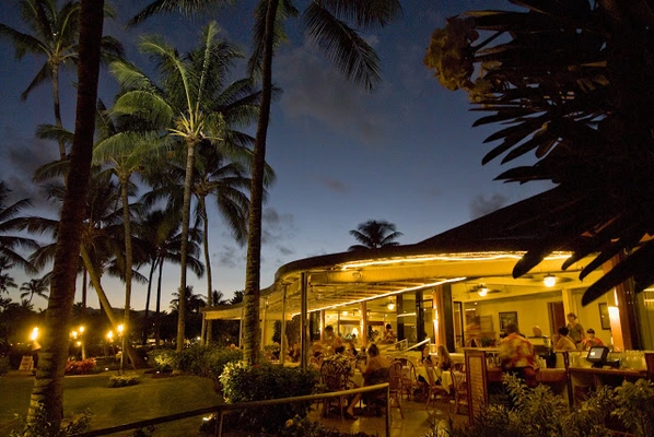 “Enjoy "gourmet" Hawaii Regional fare made with local ingredients "while watching the tiki-torch lighting in a beautiful garden setting" at this Kauai Coast Resort "jewel".”