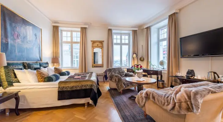 “In an elegant, early-20th-century building at the foot of the stairs to the Kärnan tower, Hotel Helsing boasts distinct, boutique-style rooms with underfloor heating, a spa and a popular restaurant.”