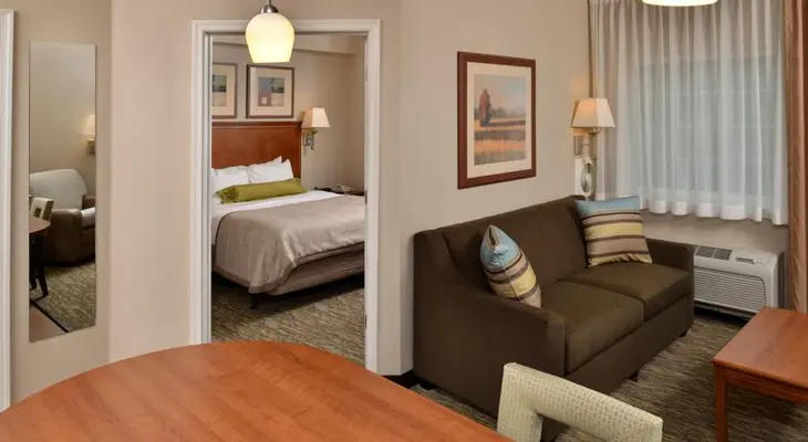 “At this suites-only hotel, the guest rooms are comfortable and tastefully decorated in muted browns and beiges.”